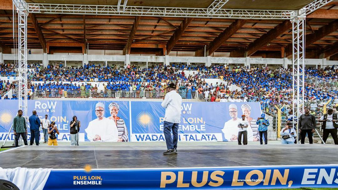 Au stade Charles-de-Gaulle de Porto-Novo, capitale Politique du Bénin, le candidat Wadagni a bénéficié d’un accueil historique. Des responsables politiques de différentes sensibilités, dont Adrien Houngbédji, sont venus saluer le candidat, illustrant une rare unité politique jamais vue dans Porto-Novo. Romuald Wadagni a cette occasion a présenté ses engagements majeurs: gratuité de l’enseignement secondaire pour les filles, introduction de l’anglais dès le primaire, extension du microcrédit pour l’autonomisation des femmes, construction d’un pont stratégique à Dangbo, et transformation de Porto-Novo en centre mondial du dialogue interreligieux alliant lieux de cultes et espaces muséaux dédiés au Vodun. “L’Institut de mathématiques et de sciences physiques (IMSP) sera également modernisé pour devenir un pôle d’innovation de référence”, a insisté M. Wadagni