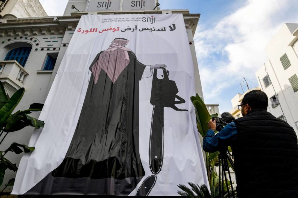 « Non à la profanation de la Tunisie, pays de la révolution », pouvait-on lire sur une affiche géante placardée sur le local du Syndicat national des journalistes tunisien (SNJT), montrant un Saoudien de dos, une tronçonneuse à la main.